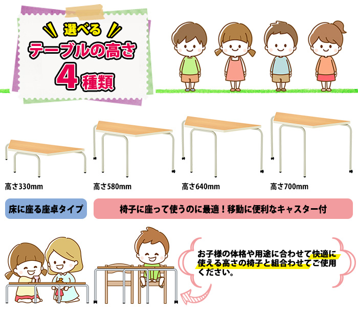 | 子供にあった高さが見つかる! 高さは床に座って使える高さ330mmの座卓タイプと、椅子に座って使うのに最適な高さ580mm、640mm、700mmの合計4タイプ。 お子様の年齢や使用目的に合わせてピッタリな1台が見つかります。 椅子に座って使うタイプは配置換えや移動がしやすいキャスター付。 |