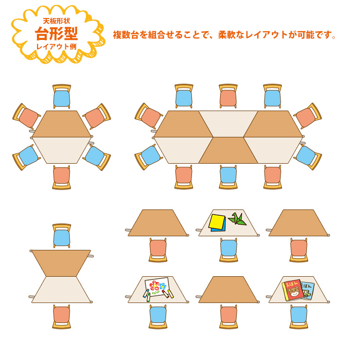 | 台形天板はレイアウトも豊富 複数台のテーブルを組み合わせることで、人数や目的に合わせた配置が可能。グループ活動から個人使用まで、幅広く対応できます。 |