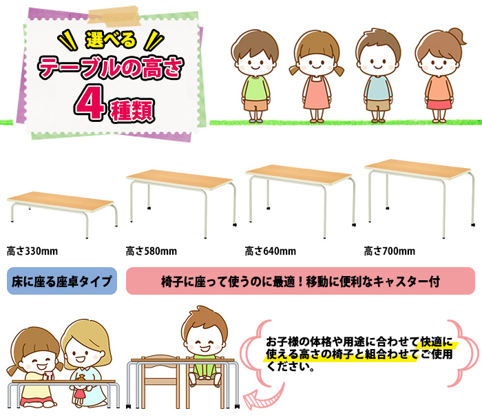 高さは床に座って使える高さ330mmの座卓タイプと、椅子に座って使うのに最適な高さ580mm、640mm、700mmの合計4タイプ。
