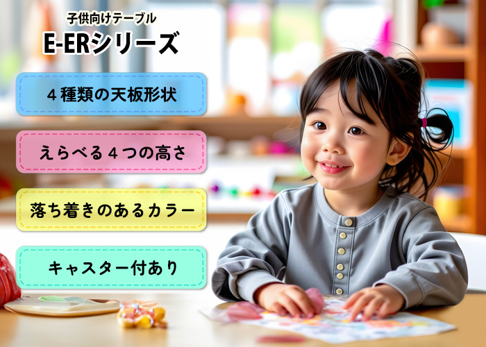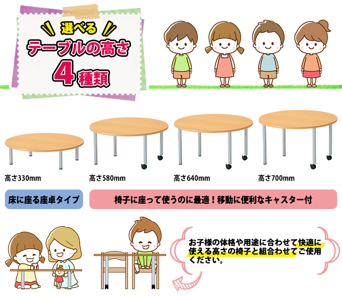 | 幼稚園・保育園・児童施設・子供塾・子供教室などの子供用テーブルにおすすめです。 ●4種類の天板形状 角型、丸型、台形型、半円型の4種類をご用意。複数台を組み合わせる事で、さまざまなレイアウトを実現できます。 ●選べる4つの高さ 高さ330mmは床に座って座卓として、高さ580・640・700mmは快適に使える高さの椅子と組み合わせて、様々なシーンで活用できます。 ●落ち着きのあるカラー 天板のカラーは、メープルとアイボリーの2色です。どんなスタイルにも合わせやすく落ち着きのある色合いで、リラックス効果が期待できます。 ●キャスター付あり 高さ580・640・700mmのテーブルには、キャスターが付いているので、ひとりでも移動やレイアウト変更が簡単です。 |