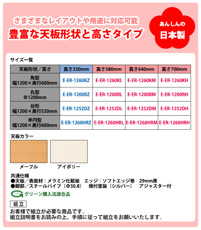 | 仕様 | ●天板/表面材:メラミン化粧板 エッジ:ソフトエッジ巻 29mm厚 ●脚部/スチールパイプ(Φ50.8) 焼付塗装(シルバー) アジャスター付 キャスター:Φ75ナイロンキャスター ストッパー付 ●グリーン購入適合品 |