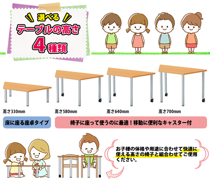 | ■高さ330mm (床に座る座卓タイプ) ・椅子からの転倒リスクがないので怪我の心配がなく安心 ■高さ580・640・700mm ・お子様が快適に使える高さの椅子と組み合わせての使用におすすめ ・移動や配置換えに便利なキャスター付 |