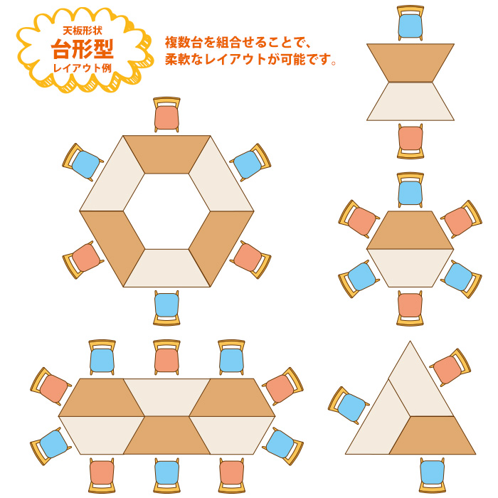 | ・台形天板のレイアウト案です ・複数台を組み合わせることで柔軟なレイアウトが可能です ・使用人数や目的、部屋のスペースに合わせて、レイアウトの参考にしてください |