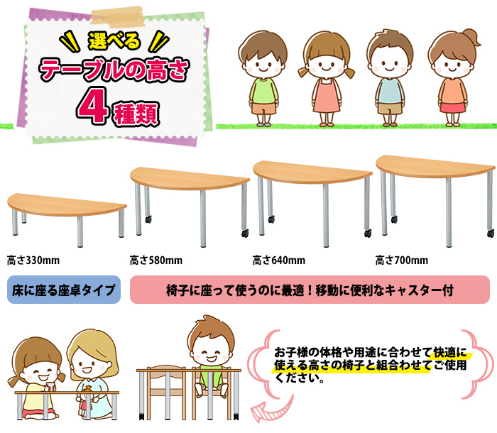 | 幼稚園・保育園・児童施設・子供塾・子供教室などの子供用テーブルにおすすめです。 ●4種類の天板形状 角型、丸型、台形型、半円型の4種類をご用意。複数台を組み合わせる事で、さまざまなレイアウトを実現できます。 ●選べる4つの高さ 高さ330mmは床に座って座卓として、高さ580・640・700mmは快適に使える高さの椅子と組み合わせて、様々なシーンで活用できます。 ●落ち着きのあるカラー 天板のカラーは、メープルとアイボリーの2色です。どんなスタイルにも合わせやすく落ち着きのある色合いで、リラックス効果が期待できます。 ●キャスター付あり 高さ580・640・700mmのテーブルには、キャスターが付いているので、ひとりでも移動やレイアウト変更が簡単です。 |