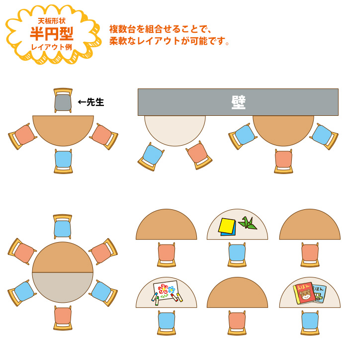 | ・半円型天板のレイアウト案です ・曲線部分に子どもたち、直線部に先生が座ることで絵本の読み聞かせや指導がしやすいです ・壁に付けて配置することで、省スペースながら十分な作業面積を確保できます ・季節の飾りつけや子どもたちの作品を展示するのにもおすすめ ・複数台を組み合わせることでグループ活動に適した空間を作ります ・複数の半円形テーブルを離して配置すると、それぞれのテーブルで異なる遊びや活動ができます ・使用人数や目的、部屋のスペースに合わせて、レイアウトの参考にしてください |
