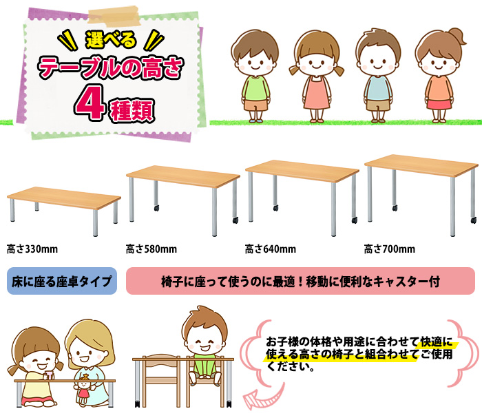 | ■高さ330mm (床に座る座卓タイプ) ・椅子からの転倒リスクがないので怪我の心配がなく安心 ■高さ580・640・700mm ・お子様が快適に使える高さの椅子と組み合わせての使用におすすめ ・移動や配置換えに便利なキャスター付 |