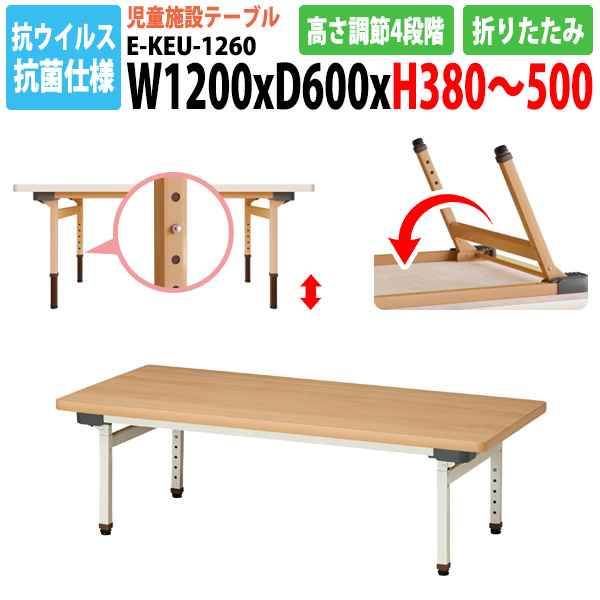 保育園 テーブル 幼稚園 机 折りたたみ 高さ調節可能 抗菌仕様 E-KEU-1260 幅120x奥行60x高さ38〜50cm 子供用テーブル キッズテーブル 学童 塾 長机 国産 日本製