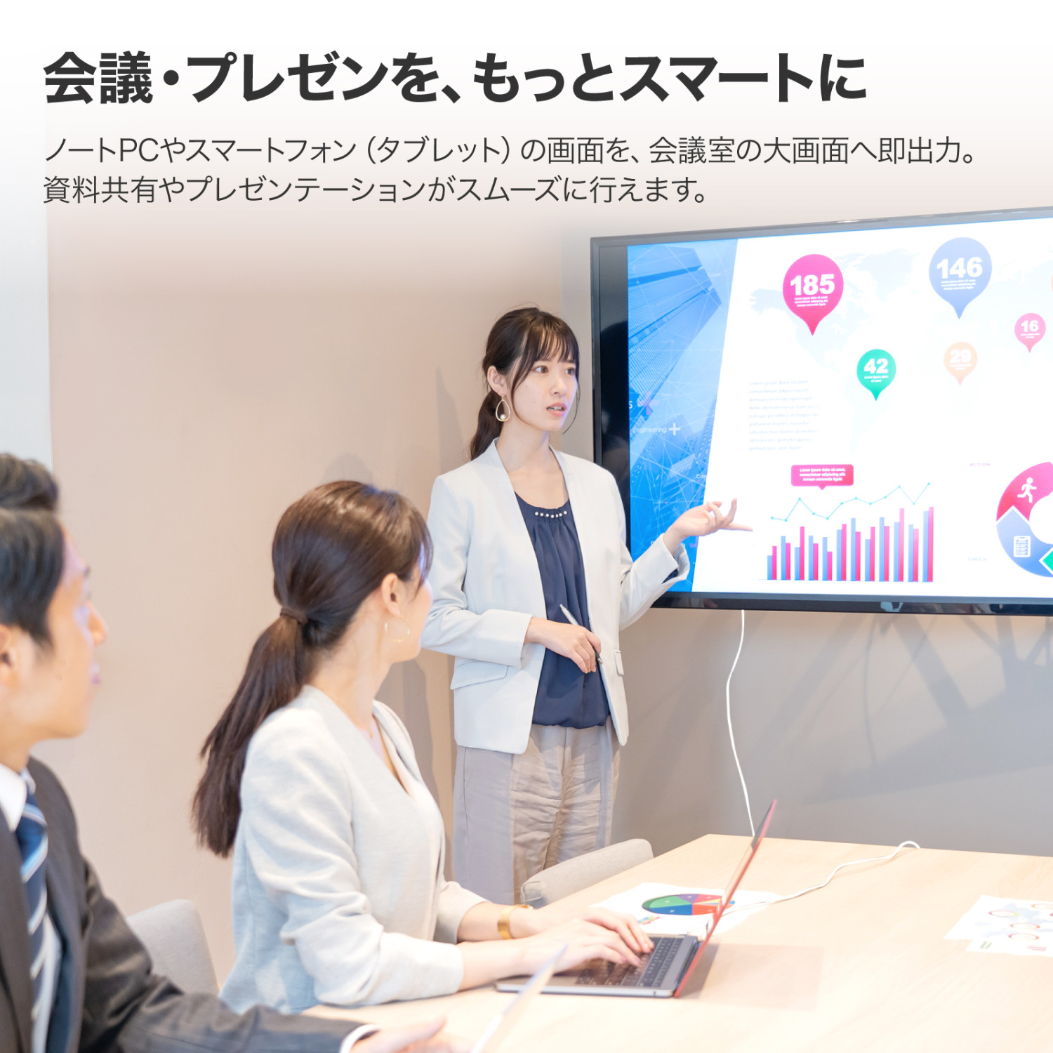 【仕事も学習も、大画面でスマートに】 ノートPCやスマートフォン、タブレットの画面を会議室や自宅のテレビ・モニターへ即出力。 プレゼンテーションや資料共有、オンライン授業まで、大画面で見やすく、スムーズに活用できます。
