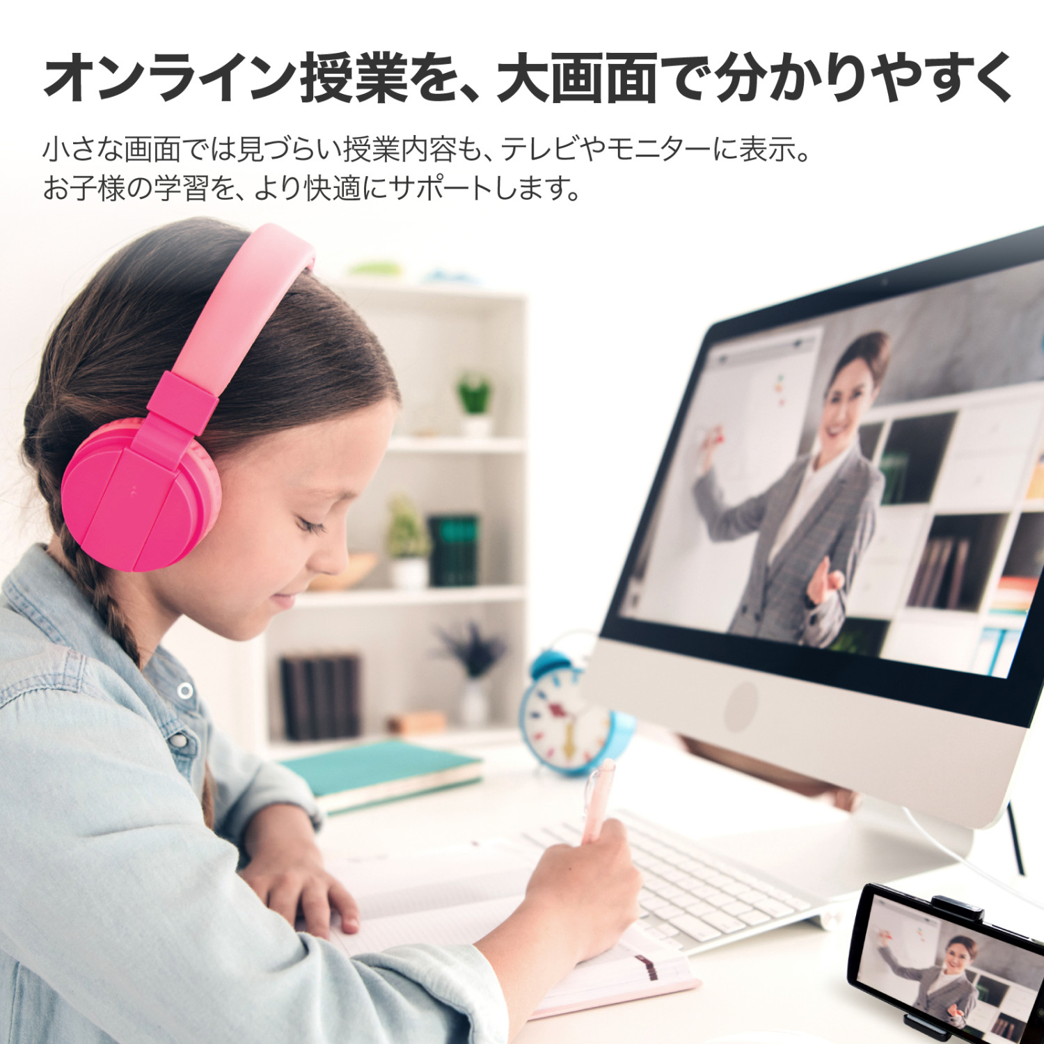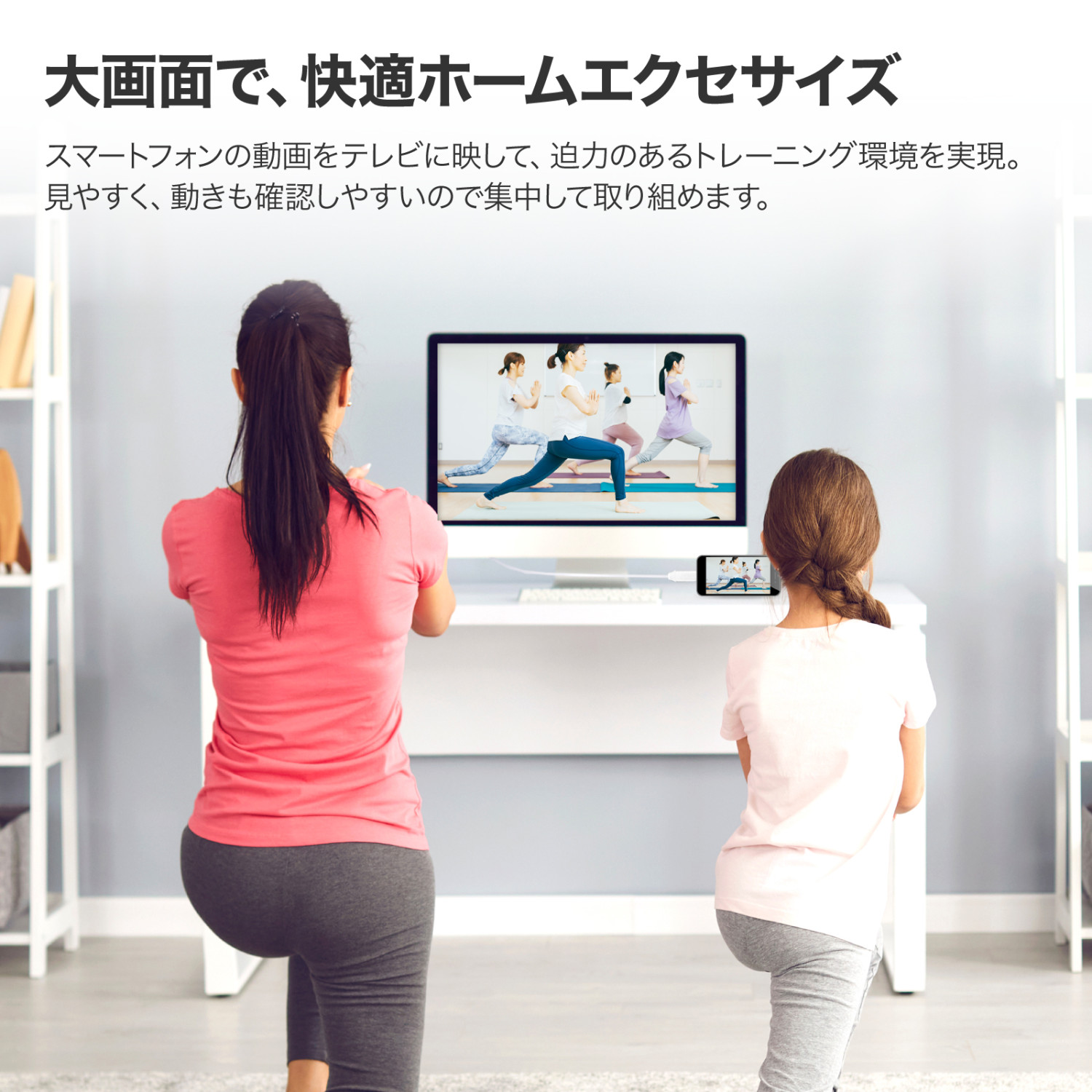 スマートフォンのミラーリング表示や、パソコンの画面複製・拡張表示に幅広くお使いいただけます。