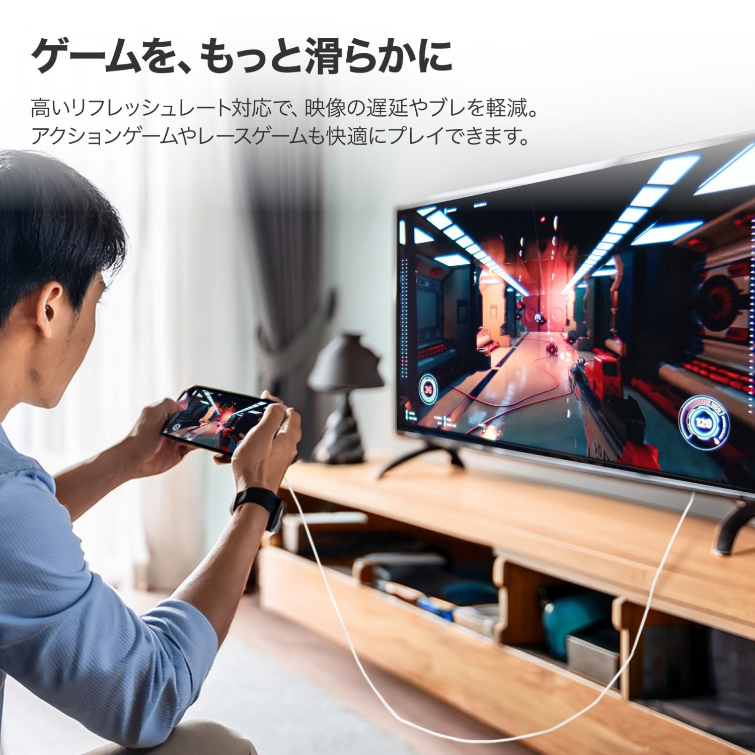 【映像もゲームも、迫力の大画面体験】 映画や動画配信サービス、トレーニング動画、ゲームをテレビの大画面で楽しめます。 高解像度・高リフレッシュレート対応で、臨場感あふれる映像と快適な操作性を実現します。