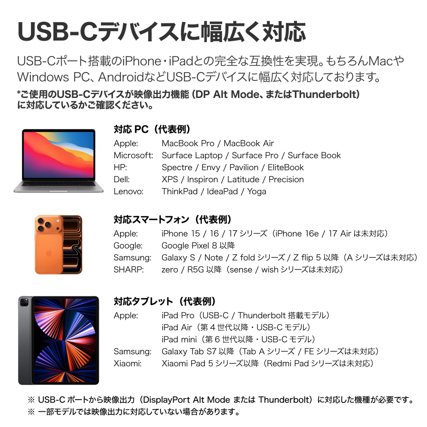 【USB-Cデバイスに幅広く対応】 USB-Cポート搭載のiPhone・iPadとの完全な互換性を実現。もちろんMacやWindows PC、AndroidなどUSB-Cデバイスに幅広く対応しております。 *ご使用のUSB-Cデバイスが映像出力機能(DP Alt Mode、またはThunderbolt)に対応しているかご確認ください。 |