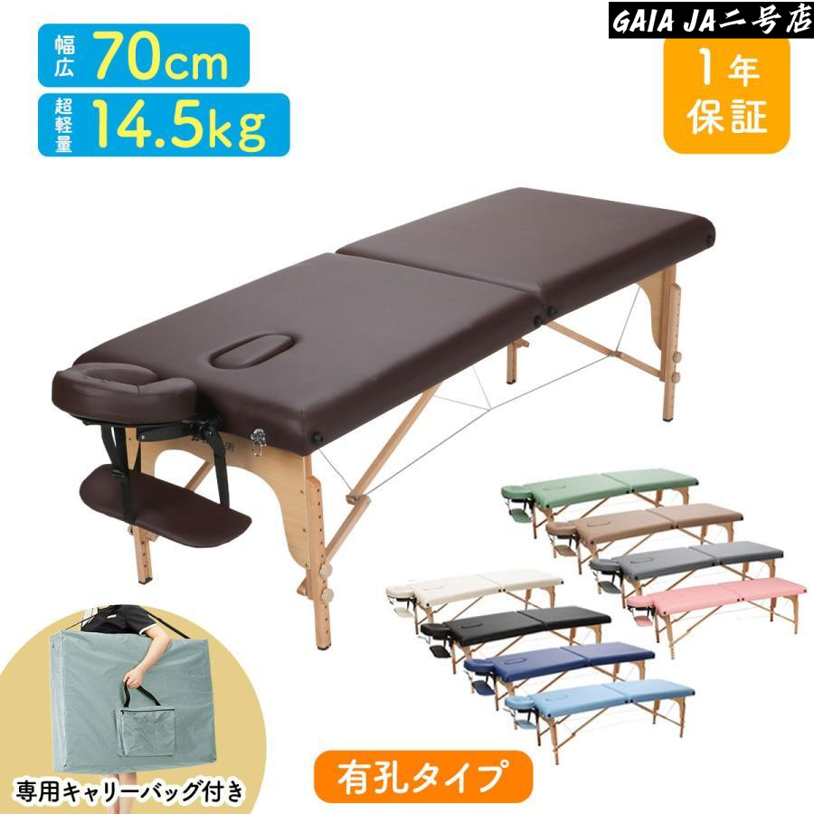 【仕様】■サイズ:長さ185cm×幅70cm×高さ52cm?82cm ■重量:約 14.5kg ■カラー: 全 9色 (カラー展開: オフホワイト 、 ダークブラウン 、 ブラック 、 ライトブルー 、 ダークブルー 、 ライトグリーン 、 ライトブラウン 、 グレー 、 ピンク )■マットの厚み:約9cm ■有孔サイズ:約22cm×12cm ■材質:生地/ PVC 、クッション/ ウレタン 、脚部/ 木製 ■機能:高さ 10段階 調節可能 ■付属品: 顔マクラ 、 ヘッドレスト 、 無孔マット 、 アームレスト (肘置き)、 キャリーバッグ