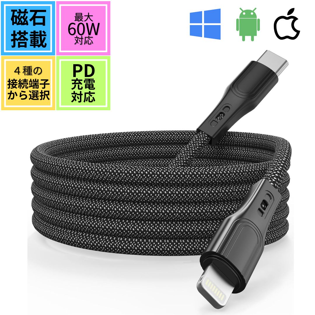 充電ケーブル マグネット ライトニング type-C USB-A 磁力吸引自動収納 1m