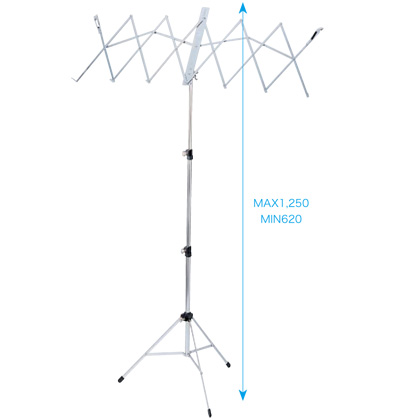 携帯用バッグ付きのアルミニウム譜面台です。他の譜面台に比べ最長1,390mmとなっており、立奏時等に便利です。