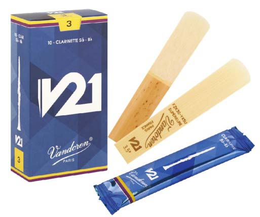 V21 リードは、銀箱の愛称で親しまれ、多くのユーザーの支持を受けているV.12 のカットに加え、バンドーレンのクラリネットリードの中でも一番新しいルピック56 に施された、ヒールを狭くした円錐形のデザインを組み合わせたリードです。