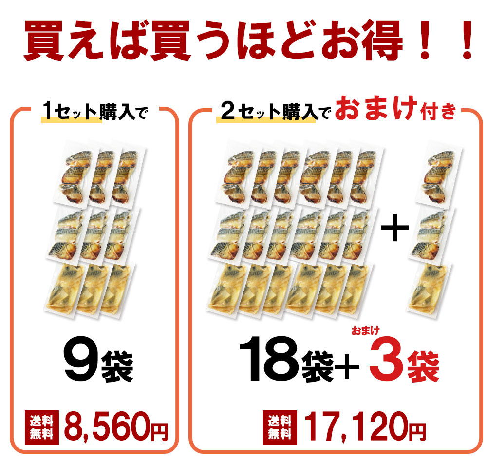 | 内 容 量 | さば西京焼き、さば塩焼き、さば味噌煮 ※調理前約20〜30gサイズ※3切れ入り×各3袋 |