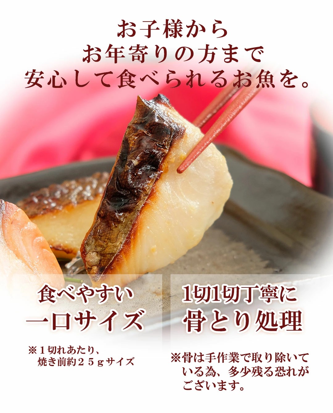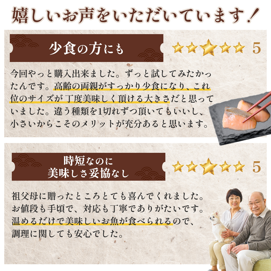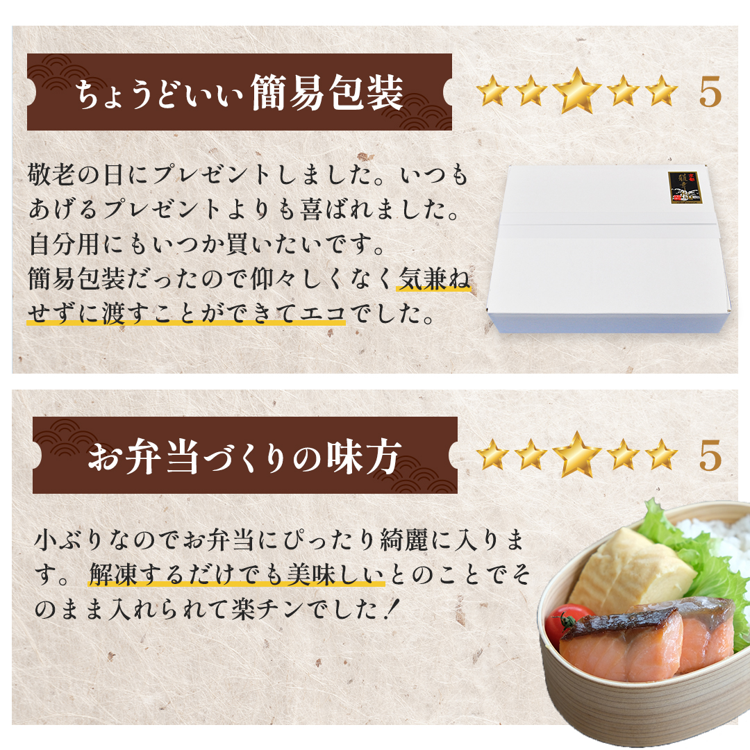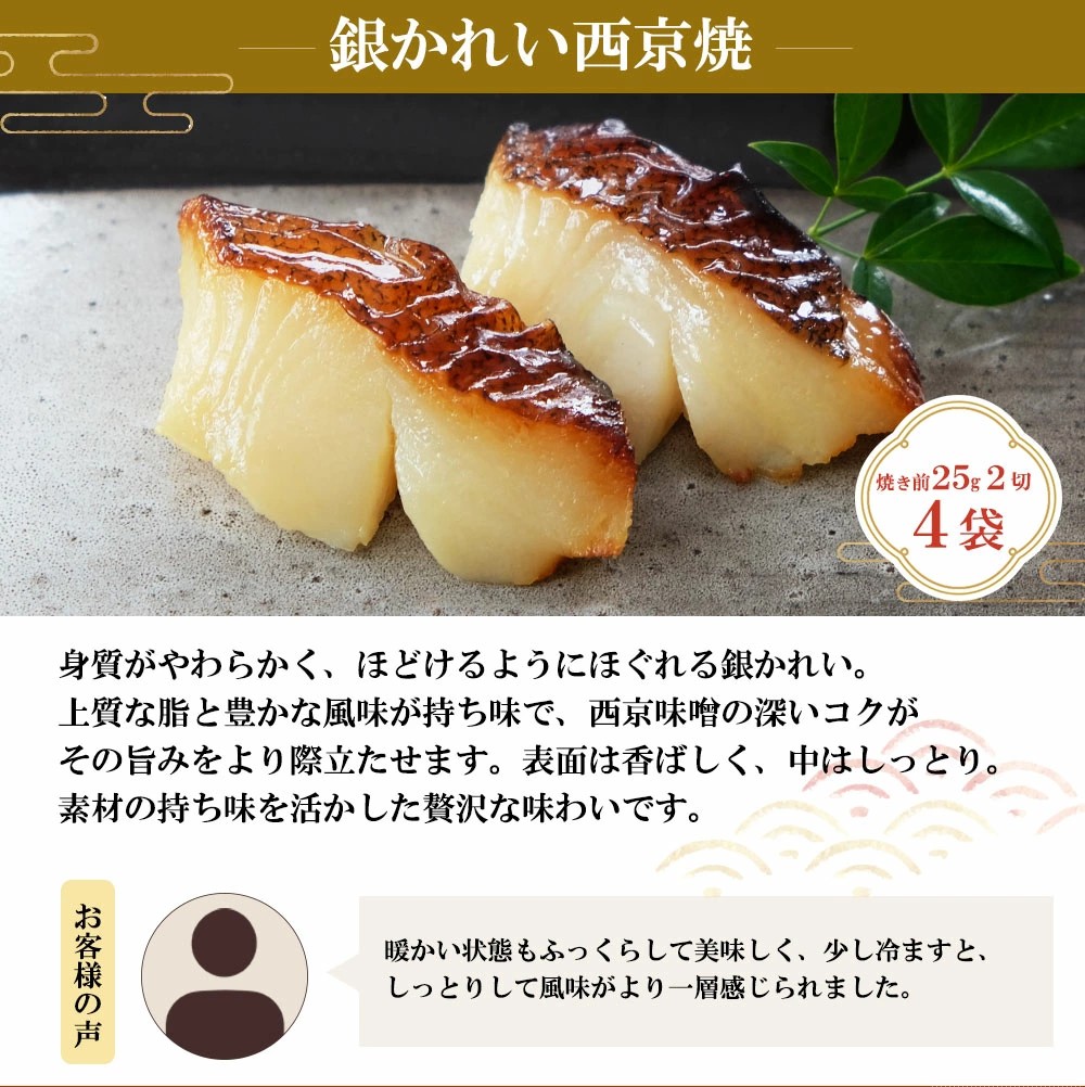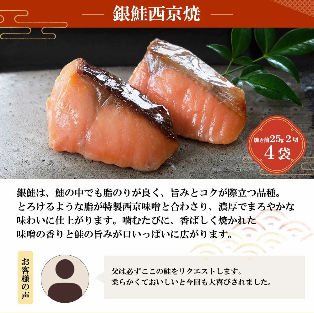 | 内容量 | 銀鮭西京焼、銀かれい西京焼、 本さわら西京焼 (各2切入)×各4袋 ※調理前約25gサイズ |