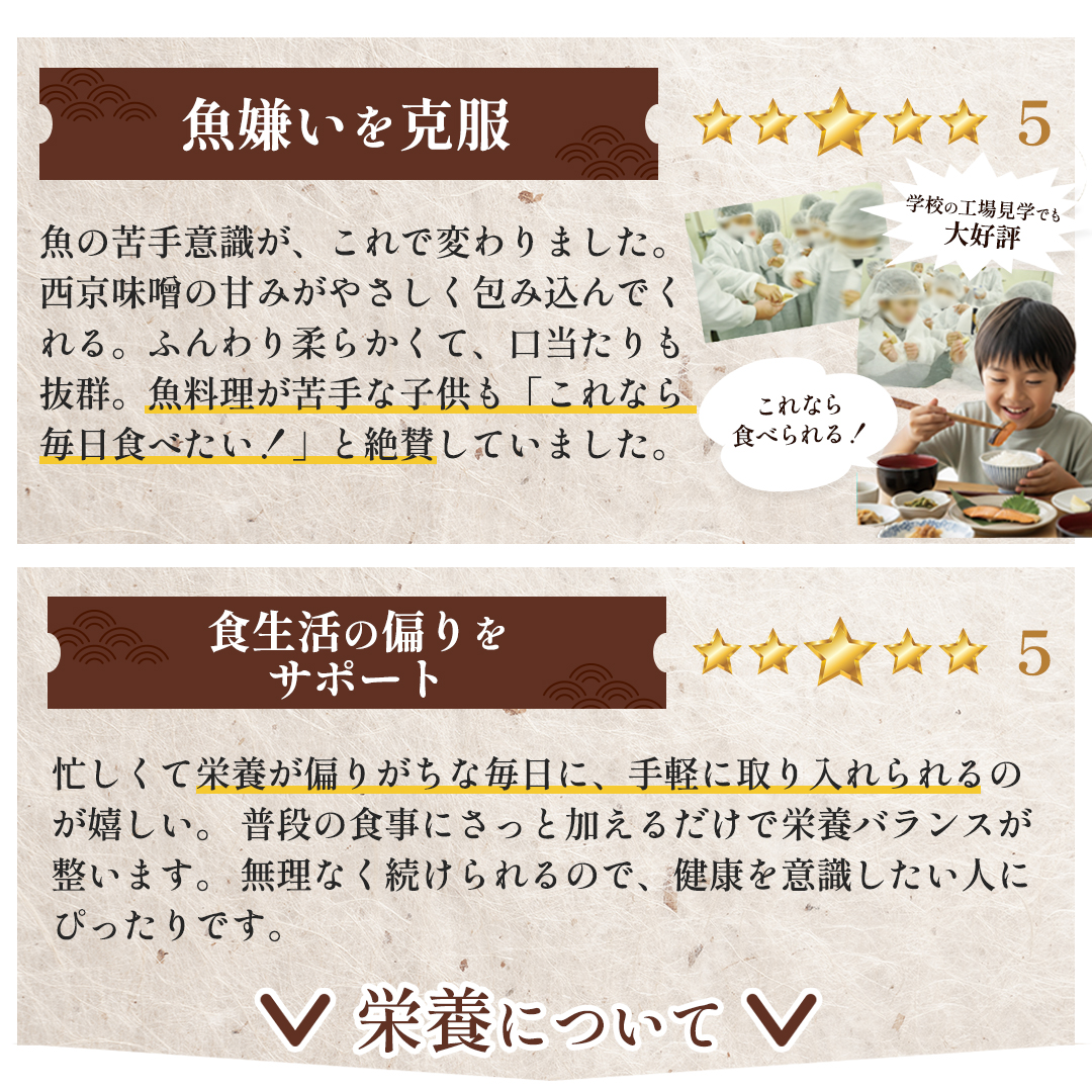 | 原材料 | 銀鮭(チリ産)、 銀かれい(デンマーク又はグリーンランド又はアイスランド産)、 本さわら(韓国産)、 味噌、食塩、砂糖、みりん、発酵調味料、豚ゼラチン、香辛料、加工でん粉、調味料(アミノ酸等)、 (原材料の一部に大豆を含む) |