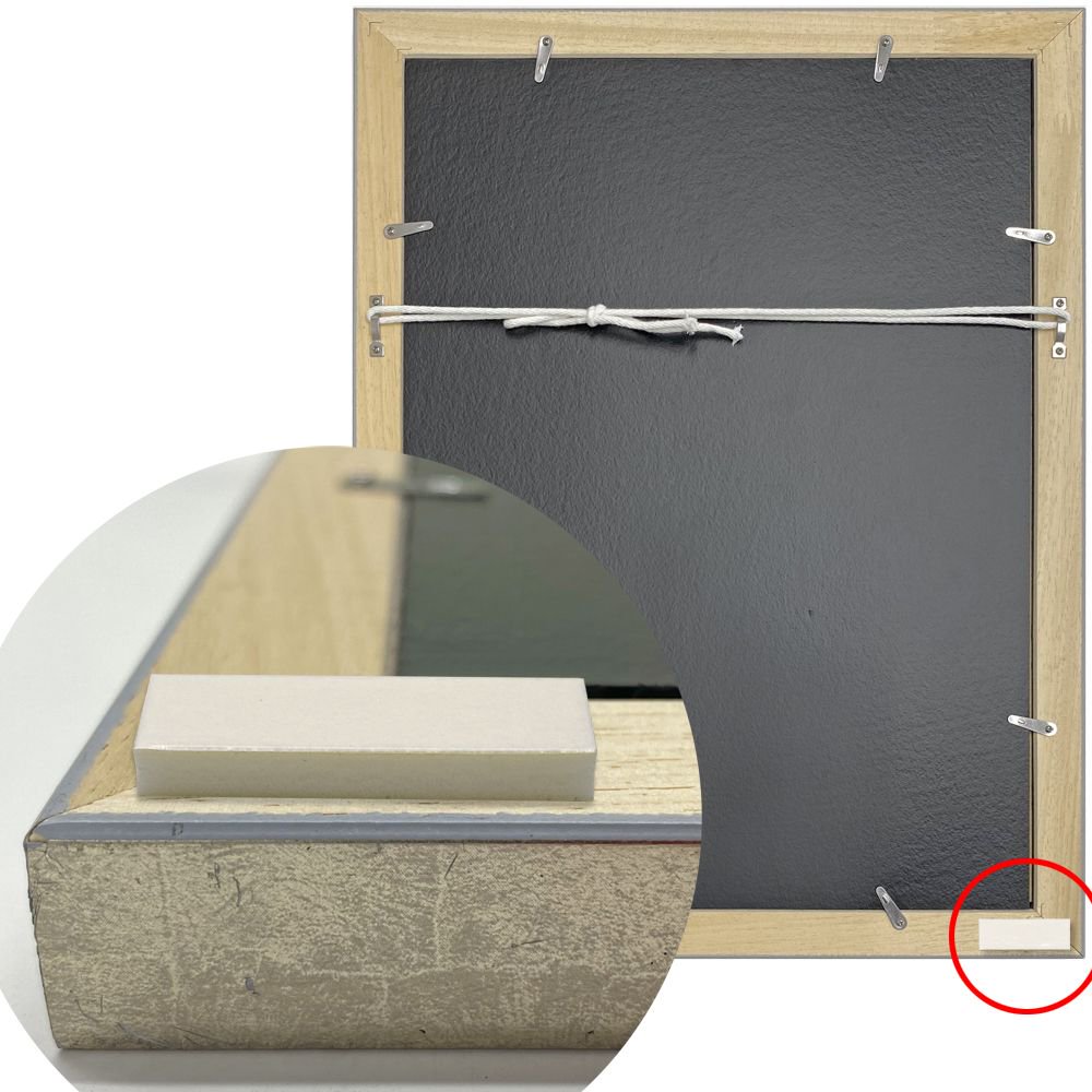 額縁と壁の間に挟まって傾きを矯正し、粘着で横振れも防ぎます。