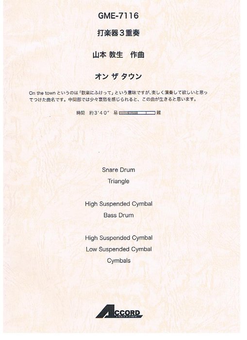 楽譜 山本教生/オン・ザ・タウン(打楽器3重奏) GME-7116/S.D. Trgl. / B.D. HighSuspCymb. / HighSuspCymb. LowSuspCymb. Cymb.
