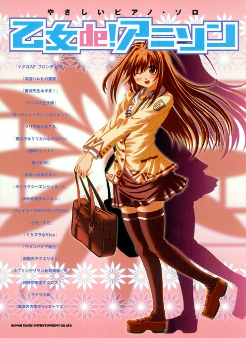 「萌える!」「不滅の!」に続いて「乙女 de!アニソン」が登場!話題の「マクロスF」「絶対可憐チルドレン」「涼宮ハルヒの憂鬱」など、女の子にスポットを当てたアニソンを中心に掲載。