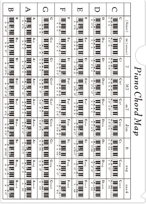 ピアノコードダイアグラムを1枚にまとめた便利なクリアファイルです。Major、m、7、M7、m7、dim、6、aug、sus4コードを掲載。見やすい鍵盤図+音名付き。【表面】C〜Bコード【裏面】C#/D♭〜A#/B♭コード
