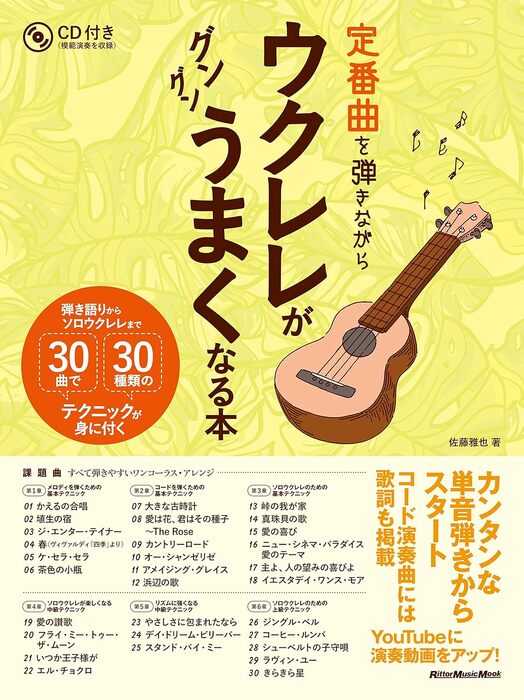 リットーミュージック/01.INTRODUCTION 本書を読むための基礎知識/02.第1章 メロディを弾くための基本テクニック/03.第2章 コードを弾くための基本テクニック/04.第3章 ソロウクレレのための基本テクニック/05.第4章 ソロウクレレが楽しくなる中級テクニック/06.第5章 リズムに強くなる中級テクニック/07.第6章 ソロウクレレのための上級テクニック/08.【収録曲】/09.かえるの合唱/10.埴生の宿/11.エンターテイナー/12.春(ヴィヴァルディの「四季」より)/13.ケ・セラ・セラ/14.茶色の小瓶/15.大きな古時計/16.愛は花、君はその種子/17.カントリー・ロード/18.オー・シャンゼリゼ/19.アメイジング・グレイス/20.浜辺の歌/21.峠の我が家/22.真珠貝の歌/23.愛の喜び/24.ニュー・シネマ・パラダイス 愛のテーマ/25.主よ、人の望みの喜びよ/26.イエスタデイ・ワンス・モア/27.フライ・ミー・トゥ・ザ・ムーン/28.愛の讃歌/29.いつか王子様が/30.エル・チョクロ/31.やさしさに包まれたなら/32.デイドリーム・ビリー…