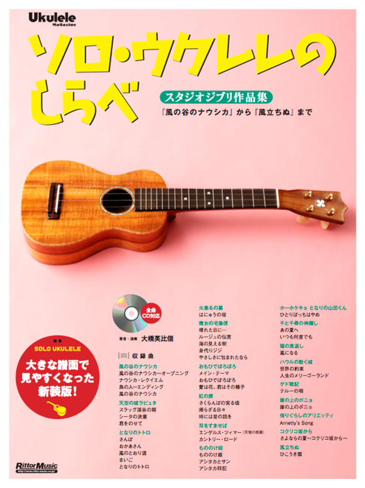 大人気の楽譜集『ソロ・ウクレレのしらべ スタジオジブリ作品集』が、増補改訂版となって新登場。『借りぐらしのアリエッティ』の楽曲までを収録した前版(2011年発行)に、「さよならの夏〜コクリコ坂から〜」と「ひこうき雲」(『風立ちぬ』主題歌)を追加し、全40曲収録の大ボリュームとなりました。また譜面が大きく、見やすくなったので、初心者からシニア・プレイヤーまで幅広い層のウクレレ愛好家に親しんでいただける1冊になっています。数々の名作を彩った曲を、ソロ・ウクレレで奏でましょう。