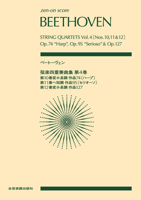 関連words:全音楽譜出版社/弦楽四重奏曲 第10番 変ホ長調 Op.74「ハープ」/弦楽四重奏曲 第11番 ヘ短調 Op.95「セリオーソ」/弦楽四重奏曲 第12番 変ホ長調 Op.127