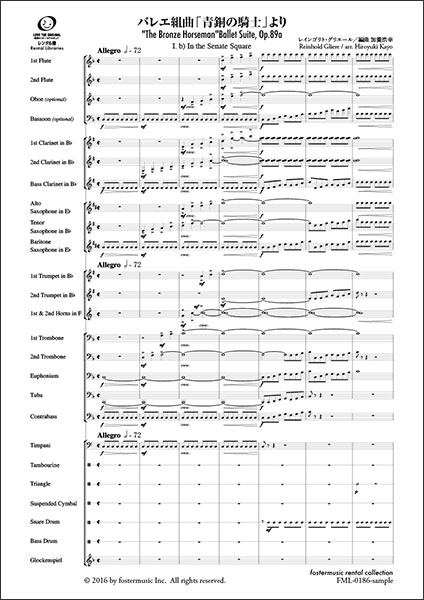 レインゴリト・グリエールの代表作の一つであるバレエ音楽「青銅の騎士」は、オーケストラで演奏される機会は極端に少なく、既存の音源も世界に数枚と限られています。彼自身の改訂による組曲版は、近年日本語版も出版されるなど楽譜を見ることは容易になりました。ある意味、吹奏楽で頻繁に演奏される事の影響かもしれません。そんな組曲版も原曲は非常に大きな編成でハープ2台にピアノ&チェレスタと、とても豪華さや優美さが描かれています。よって、メロディーや音楽の構築がとても分かりやすく、すぐに体に沁みてくる音楽なのですが、少人数でも頑張るメンバー達には楽譜上のハードルが少々高いように感じました。そこで、今回思い切って25名程度の人数で演奏出来るようにアレンジを試みました。部分的に難易度の高い部分もあり、容易とは言い難いのですが、逆にやり甲斐のある名曲を取り上げることで、成就感も得られると考えました。演奏上の留意点ですが、一番にバランスを挙げておきます。ダイナミクスの指示は、グリエールの指定通りの部分が大半なのですが、特に伴奏はメロディーの音楽感を正確に把握し、単に「フォルテ=大きく」・・・的にならないように配慮して欲しいです(部分や編成によっては、極端な音量への配慮が必要です)。指導者は客観的に客席での聴こえ方を大事に仕上げて下さい。また各曲毎に音色の変化も欲しいところです。エンディングの「偉大なる都市への賛歌」は現在もサンクトペテルブルクに鳴り響く鐘を想像し、味わいをもった演奏を心掛けて下さい。(加養浩幸)