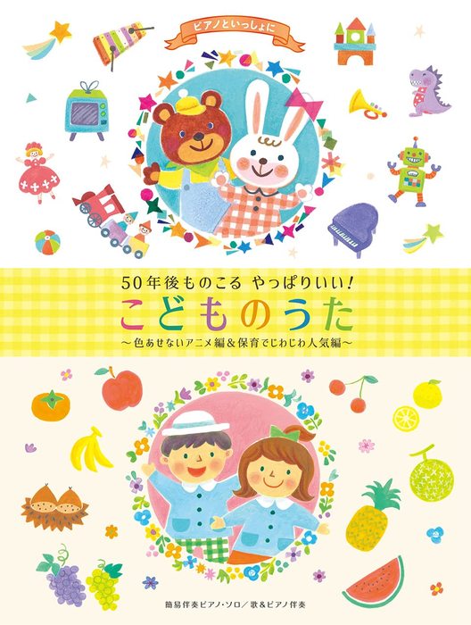 キングレコードから発売された「50年後ものこる やっぱりいい!こどものうた」の「色あせないアニメ編」と、2021年10月6日に発売される「保育でじわじわ人気編」の2枚を1冊にまとめたやさしく歌いやすい、弾きやすいピアノ楽譜集です。名アニメソングと、保育の現場で広がりつつある名曲の数々をやさしいピアノ・ソロにアレンジ。卒園式や発表会などで映えるアレンジの「歌&ピアノ伴奏」も4曲掲載しています。