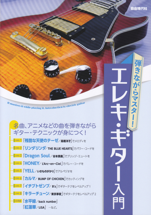 関連words:自由現代社/【ギター、テクニック、音作り解説】/■練習の前に・・・これだけは覚えておこう!/■STEP1 ギターの各部/ストラト・タイプ/レスポール・タイプ/■STEP2 ピックアップ/■STEP3 これだけあれば大丈夫!/ピック/弦/チューナー/シールド/アンプ/■STEP4 音を合わせよう/開放弦/チューナーの使い方/■STEP5 アンプの接続の仕方/■STEP6 TAB譜を読もう!/TAB譜の見方/■STEP7 弦の交換方法/■STEP8 テクニックを覚えよう/ハンマリング・オン/プリング・オフ/スライド/グリッサンド/チョーキング/■STEP9 サウンドメイキング/アンプ/アンプのセッティング/■STEP10 エフェクター/コンパクト・エフェクターの種類/マルチ・エフェクター/エフェクターの接続順序/【曲を弾きながらギターテクニックを身につけよう!!】/■LEVEL1 「残酷な天使のテーゼ/高橋洋子」でメロディを弾いてみよう!/左手のフォーム/ピックの持ち方/右手のピッキング/♪残酷な天使のテーゼ/■LEVEL2 「リンダリンダ/THE BLUE HEARTS」でパワーコードを弾いてみよう!/他