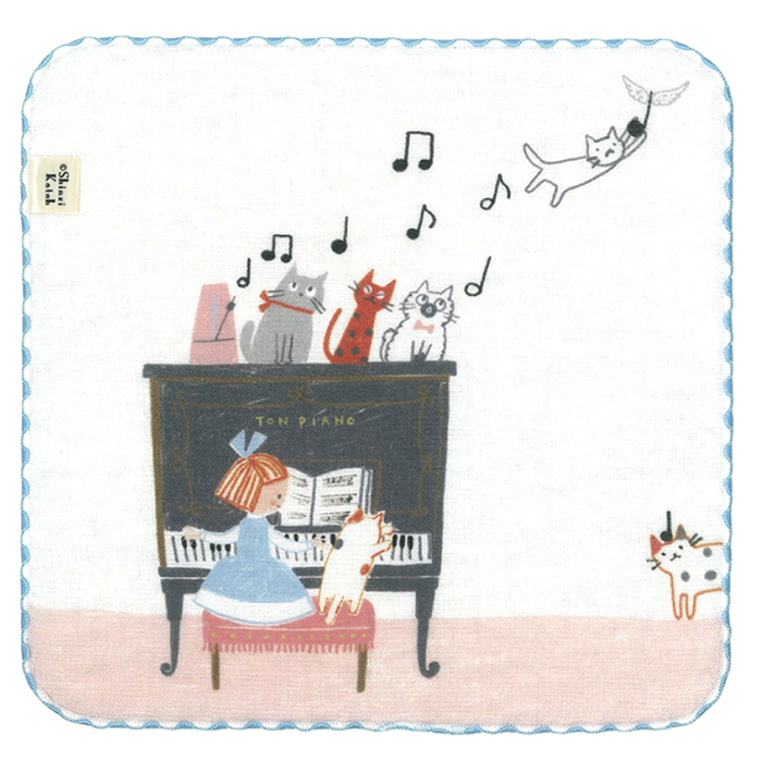 SKTC198-04 トンピアノ・タオルチーフ/ねこと女の子(【935】 サイズ:約縦230×横230mm/素材:綿100% ガーゼ&無撚糸/生産地:日本製(泉州タオル))
