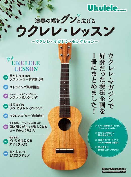 ウクレレ・マガジンで過去に掲載した奏法企画より、演奏力が高まるよりすぐり企画を1冊に集約。ウクレレ・マガジン誌で過去に特集した奏法企画のうち、人気の高かった8企画をまとめたムック本がついに発売! 脱初心者を目標にした基礎固め企画から、ジャカソロ演奏のためのノウハウ、アレンジ講座、アドリブ入門など、一歩踏み込んだトレニーングをしたい人に向けた内容です。理論の解説は最低限にとどめ、弾きながら学んでいくスタイルになっているので、これまで“敷居が高いな〜”と思っていた人も体得しながら自然に覚えられますよ! ウクレレ・マガジン誌面掲載時に付録CDと連動していた音源は、本誌特設ページにて視聴できるので、スマホやPCがあれば手軽に聴けるようにもなっています!