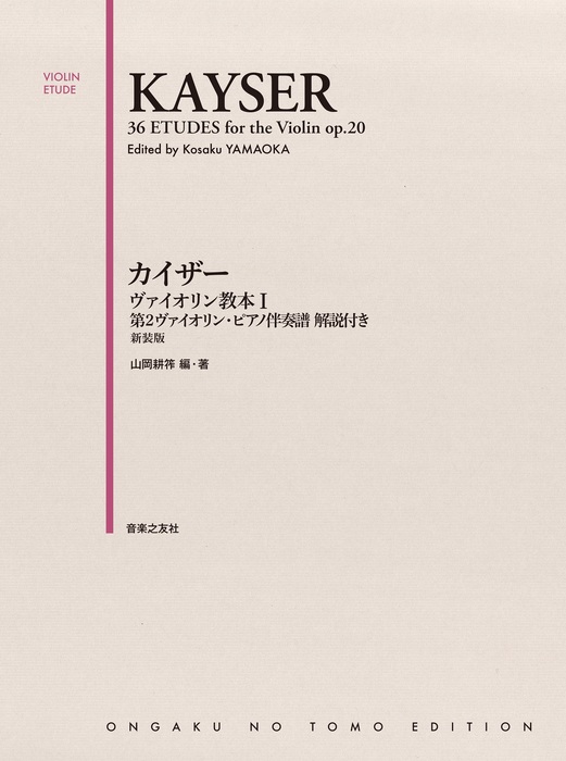 「ヴァイオリン学習者が最初に取り組むエチュード」として学習者必携の王道教材であるカイザー教本。1992〜93年にかけて山岡耕筰編纂のもと刊行されたが、その後手に入らない状況が続いた。ピアノ伴奏譜や充実の解説へ長い間多くの要望の声を受け、このたび満を持して復刊。「ヴァイオリン学習者が最初に取り組むエチュード」として学習者必携の王道教材であるカイザー教本が多くの要望の声を受け復刊。最大のポイントは、他では手に入らない伴奏譜(第2ヴァイオリン/ピアノ)の存在。第2ヴァイオリンで先生とデュオ、またピアノがあればピアノ伴奏でさらに充実したアンサンブルができる。退屈と思われがちなカイザーをアンサンブルすることで飽きずにレッスンでき、また「ハーモニー感の欠如」が問題となっているヴァイオリン学習者の一助となろう。第1巻は、第1ポジションの仕上げを目指すための緻密な構成がなされている。第2ヴァイオリンやピアノ・パートを見れば、カイザーの本来の意図をより深く読みとることができ、山岡氏による各練習曲に対する惜しみない研究が反映された解説も必見。他にはないカイザー解釈に触れることができる。