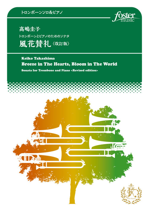 作曲にあたり、吉川氏から「作品をあまり平易なものにはせず、演奏しがいのあるものにしてほしい。」という要望がありました。あれこれ悩みましたが思案の末に四つの楽章からなる「ソナタ」を書くことに決め、出来上がったのが本作品です。初版の出版後、全国各地で再演の機会が得られましたが、その演奏を聴くたびに作曲当初には思いつかなかった気づきがありました。そして、たびたび演奏を聴くうちに、その気づきを楽曲に反映させ、更により魅力的な作品にしたいという想いが次第に強まっていきました。改訂版の作成にあたり、吉川氏からもたくさんの気づきや助言をいただくことができました。それをふまえ、楽譜に手を加えては試奏をするという作業を繰り返しつつ、改訂版を練り上げていきました。言うまでもなく、楽譜は作曲者と演奏者を結ぶツールです。そのツールを通して、楽曲に対する私の想いが演奏者に正しく伝わるように、テンポ・ディナーミク・アーティキュレーション、等々の楽譜に対する表記も細かく見直しました。本作品を演奏してくださる皆様には、楽譜に記されている一つ一つの記号も含め、楽譜を通して私の楽曲に対する想いを受け止めていただいた上で、ご自身の演奏を追求していただきたいと思います。〈演奏にあたってのお願い〉第一楽章 序奏として奏でられる穏やかな旋律の反復は遠くから聞こえてくるように。その後に現れる主題は堂々と勇ましく。第二楽章 Nostalgia 短調ではありますが、それは悲しみの音楽ではなく望郷の念を表しています。ゆったりとした三拍子ですが停滞することなく静かに前へと進んでください。第三楽章 Serenade この楽章では、トロンボーンに弦楽器におけるチェロのような滑らかで軽快な旋律の動きを求めています。揺れ動きながら決して重くならないように旋律を美しく歌い上げてください。第四楽章 主題の性格を十分捉えて、決然とリズムを刻みながらも軽快さを失わないように演奏してください。テンポは早くなりすぎないように、しかし前へと進んでいく推進力を望みます。Fからのコーダでは、第1主題の冒頭部分が時折現れながら曲尾に向かっていきます。最後は朗々と高らかに歌い上げてください。全曲を通してピアノパートには、時にはオーケストラがトゥッティで演奏するような厚みのあるサウンドを、また時には小編成の室内楽アンサンブルに見られるような繊細で表情豊かな楽器の音色をイメージして書いています。ピアノ奏者の方は、それらを楽譜から読み取った上で、しっかりトロンボーンパートを支えてください。「風花賛礼」の「風花」とは、人と人との間に吹く風が様々な出会いをもたらしそれによって咲く花のことを指しています。この曲を演奏してくださる方、そして聞いてくださる方の心の中にも色とりどりの花が咲くことを願っています。(2023年5月 高嶋圭子)