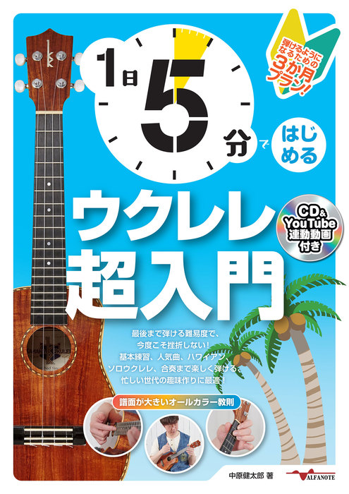 趣味で楽器を始めてみたいけれど、ギターは重いし難しそう・・。それなら軽くて今大人気のウクレレはいかがですか?最後までついていける&弾ける難易度で、今度こそ挫折しない!基本練習、人気曲、ハワイアン、ソロウクレレ、合奏までバラエティ豊かな内容。1日5分ほどでできる「今日はコード1つだけ、今日は右手の動きだけ」、などから始まる狙いを絞った練習メニューが3か月分。大きな譜面、オールカラー、見やすいレイアウトだから飽きない、目が疲れない!内容が簡単に理解できるので、これまでの教則本についていけなかった初心者の方にこそオススメ。細かい動きが本だけだと分からない?もちろん、全ページ対応のレッスン動画が充実しているので安心!忙しい方にぴったり!ウクレレ超初心者向け教則本の決定版です。