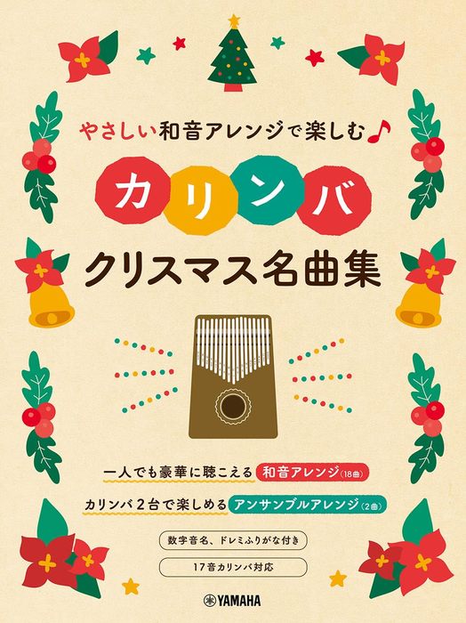 好評の「和音アレンジで楽しむカリンバ」シリーズにクリスマス編の登場です! 誰もが知ってるクリスマスの定番曲から、一人でも豪華に聴こえる「メロディ+伴奏」の和音アレンジを18曲、イベントやサークルなどでも使いやすい2台のカリンバで演奏できるアンサンブルアレンジを2曲、計20曲収載しました(17音カリンバ対応)。和音アレンジは同シリーズと比べて少しやさしいアレンジになっているので取り組みやすく、クリスマスシーズン中に楽しむのにぴったりです! 楽譜にはドレミふりがなに加え、楽器に刻印の数字音名も全曲掲載。楽器と照らし合わせながら気軽に演奏していただけます。冒頭には、カリンバの音名と五線の対応表、やさしい音楽の決まりごと、基本的なカリンバの弾き方解説ページも掲載しているので、楽譜初心者、楽器初心者の方でも安心! クリスマスソングにぴったりなやさしい響きをもつカリンバで楽しんでみませんか?