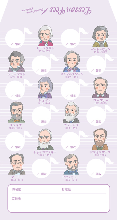 歴代の作曲家がかわいいイラストになった月謝袋