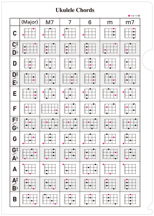 ウクレレのコードダイヤグラムを掲載したクリアフォルダー。C〜B(12音)×コード12種。掲載コード:Major, M7, 7, 6, m, m7. sus4. 7sus4, m6, m7-5, dim(dim7), aug。