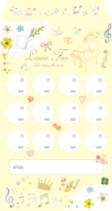淡いイエローにやわらかなタッチのピアノや音符のイラストが大人可愛い月謝袋。