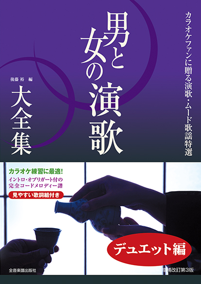 カラオケ愛好家必携!デュエット演歌ばかりを集めた嬉しい曲集。演歌を中心にデュエットソングを贅沢に集めた一冊。前・間・後奏、オブリガードも付いた完璧なコード・メロディ譜。見やすい歌詞組付きです。ポップスコーナー付き。