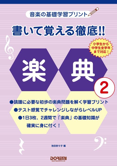 各巻1日3枚、2週間完結で、楽典の基礎知識が広く確実に身に付きます。[1]は幼稚園から小学生全学年まで、[2]は小学生から中学生全学年まで対応!