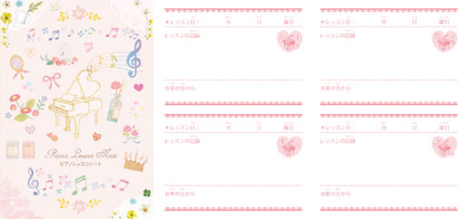 ★出席表&レッスンカレンダー付き☆見開き1ページで4レッスン分書けるコンパクトなレッスンノートです♪“レッスンの記録"+“お家の方から欄"のみのシンプル設計。44レッスンまで対応。大人かわいいピアノのイラストが特長。