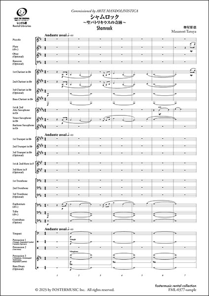 この曲はARTE MANDOLINISTICAの委嘱により作曲しました。原曲はマンドリン合奏のための作品ですが、吹奏楽の編成で演奏できるよう、再考しました。シャムロックは、三つ葉のクローバーです。パトリキウスがこの植物を使って三位一体の教義を説いたというもので、パトリキウスとシャムロックは、アイルランドの文化や信仰と密接に結びついています。彼の教えや影響でシャムロックが象徴的な存在となり、アイルランドの人々にとって非常に重要なシンボルとなりました。パトリキウスはアイルランドの守護聖人で、キリスト教と在来信仰を融和させる形でキリスト教を布教したことで知られています。彼の生涯や教えは、アイルランドの文化や歴史に大きな影響を与えました。彼の命日と伝わる3月17日は記念日とされ、セント・パトリックス・デイとして盛大に祝われています。曲は、穏やかなテンポで主題の断片を奏で、やがてテンポを速めアイリッシュのジグに展開していきます。後半は民謡のような主題を全体で歌い上げ曲は幕を閉じます。(樽屋雅徳)■編成:Pic./Fl. (div)/Ob. (Optional)/Bsn. (Optional)/Bb Cl. 1/Bb Cl. 2/Bb Cl. 3 (Optional)/Bs.Cl./A.sax. 1/A.sax. 2/T.sax./B.sax./Trp. 1/Trp. 2/Trp. 3 (Optional)/Hr. 1/Hr. 2/Hr. 3 (Optional)/Trb. 1/Trb. 2/Trb. 3 (Optional)/Eup. (B.C./T.C.)(div)/Tuba (div)/S.Bs. (Optional)/Timp./Perc. 1 (Tri., Sus. Cym., Cast.s (Spoons))/Perc. 2 (Tom-toms)/Perc. 3 (Vib., Glock., Tamb., Sus. Cym.)/B.D. (Optional)