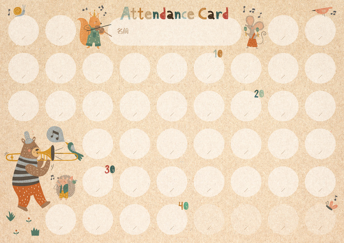 クラフト紙風の背景にかわいい動物たちが演奏する出席カードです。