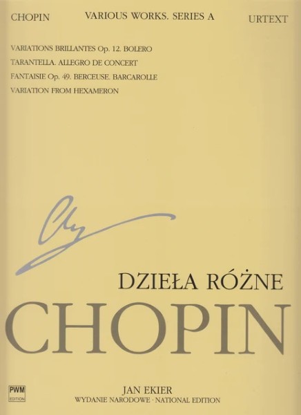 PWM ポーランド音楽出版(P) 【PWMA12】【収録曲】1:Variations Brillantes in B flat major Op.12 華麗なる変奏曲 変ロ長調 作品12/2:Bolero in A minor Op.19 ボレロ イ短調 作品19/3:Tarantella in A flat major Op.43 タランテラ 変イ長調 作品43/4:Allegro de Concert in A major Op.46 演奏会用アレグロ イ長調 作品46/5:Fantaisie in F minor Op.49 幻想曲 ヘ短調 作品49/6:Berceuse in D flat major Op.57 子守歌 変ニ長調 作品57/7:Barcarolle in F# major Op.60 舟歌 嬰ヘ長調 作品60/8:SUPPLEMENT:Hexameron Sixth Variation Dbop.29 補遺:ヘクサメロン第6変奏曲 ショパンの生存中に出版された作品群Aの第12巻 (出版通し番号:第12巻目) ヤン・エキエルによるナショナル・エディション。 ショ