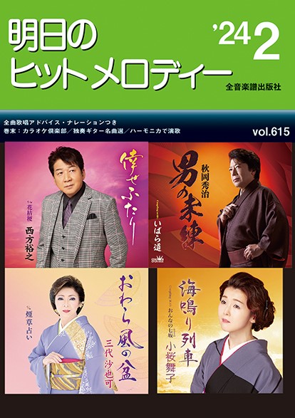 (株)全音楽譜出版社 【9784117686265】【768626】【収録曲】あなただけ(リアレンジバージョン)/あんちゃん/鵜の岬/海鳴り列車/男の未練/おわら風の盆/女の燗月夜/さだめの海/倖せふたり/紀ノ川よ/幸福のゆりかご/誰にでも秘密がある/ヒヨコグサ/春子のララバイ/ルージュの蝶々/雪の南部坂/ふうふ/浮世がらす/裏窓の猫/越後瞽女/大川くだり/釧路発5時35分根室行き/罪の恋/中山道/名残り花/春待つ女 CD音源完全コピーのイントロ・間奏・後奏付メロディー譜!カラオケファン必携の演歌・歌謡曲の最新曲をいち早く集めた楽譜集。前・間・後奏、オブリガート、テンポ表示、リズム型、冒頭ナレーションと歌唱アドバイスまで入った完璧な楽譜になっています。歌の練習に、伴奏に、バンド演奏に最適です。巻末にはタブ譜付きの「独奏ギター名曲選」、最新演歌が吹ける「ハーモニカで演歌」、分かりやすくて丁寧な指導の「カラオケ倶楽部」を収録。音楽マメ知識付きです。