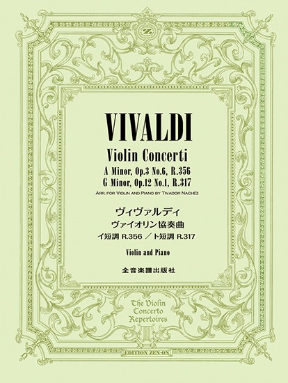 ヴァイオリン初〜中級のレッスンで欠かせない ヴィヴァルディの2つの協奏曲 RV356(イ短調、Op.3-6)と RV317(ト短調、Op.12-1)の全楽章をパート譜&ピアノ伴奏譜のセットで出版。ナッシェ版といわれる一般のレッスンやコンサートで使用されているヴァイオリン・ソロの楽譜です。これは全音が1956年に発行した楽譜の合本復刻で、楽譜の内容はあらためて校正がなされて、当時掲載されていた音楽評論家・属 啓成氏の解説を併せて掲載しています。当時の味わいあるデザインの装丁も復活。