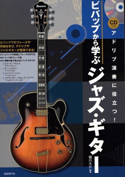 (株)自由現代社 【9784798225883】【2588】 ジャズ・ギターがいまいち上手く弾けない、アドリブが弾けないといった方を対象に、ビバップでのフレーズの特徴を学び、アドリブやジャズ・ギター習得を目指す本。カンタンな音楽理論とフレージングを学び、その後は実際に使えるフレーズを弾きフレーズのネタを増やす。最後は実際のスタンダート曲のテーマとアドリブに挑戦!